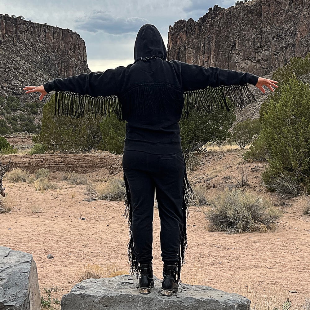 Black hooded sweatshirt with long embellished 7" long fringe along sleeves and back, rope tassel tie closure. Shown styled with mesh scarf and matching sweatpants. 80% cotton 20% polester blend made in Los Angeles, CA.